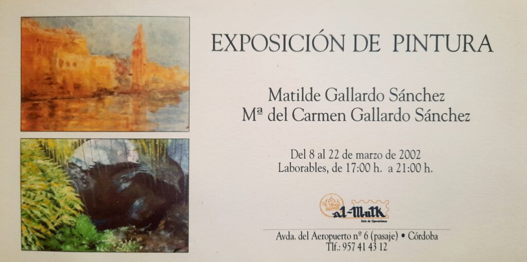 - I Exposición colectiva de pintura y escultura en la Sala de Arte Amigos de los Patios Cordobeses. Córdoba.